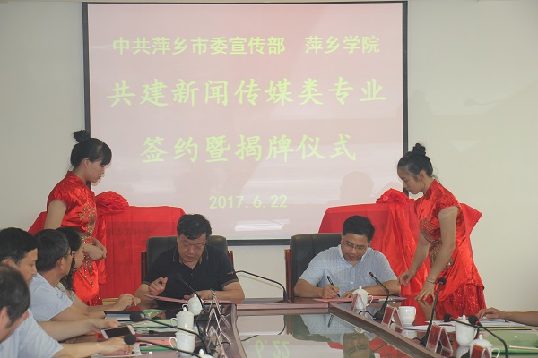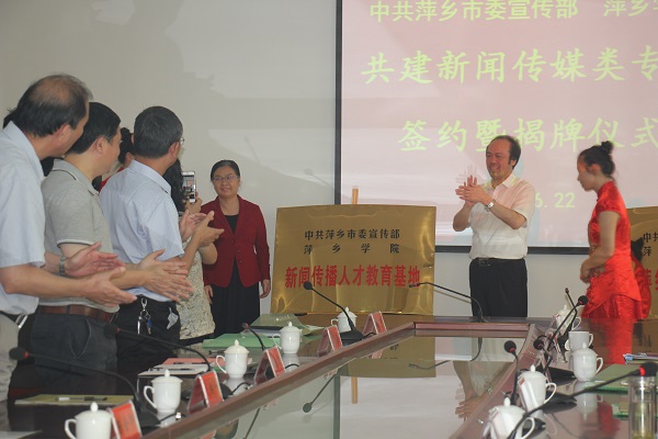 6月22日,中共萍乡市委宣传部与我校共建新闻传媒类专业签约暨揭牌仪式在至善楼举行,这标志着萍乡市在新闻人才培养机制的改革创新上迈出了新步伐、我校在提升新闻传媒学科办学层次和办学水平方面走上了新起点,拉开了地校协同育人办学模式的序幕。市委常委、宣传部长聂小葵讲话并与院党委书记陈金印一同揭牌,院长史焕平致辞,院党委委员、副院长郭伟主持。
