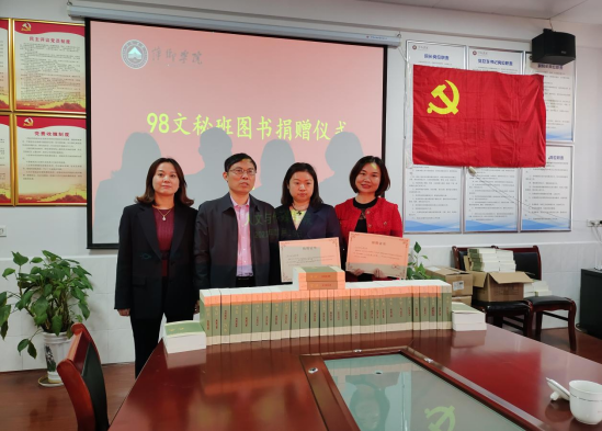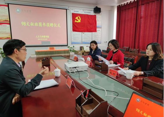 11月19日下午,欧洲杯下单平台官网在跬步楼1404会议室举行了98文秘班图书捐赠仪式。院长易志文出席本次捐赠仪式,校友杨倞、曾红桃、张玲参加会议。