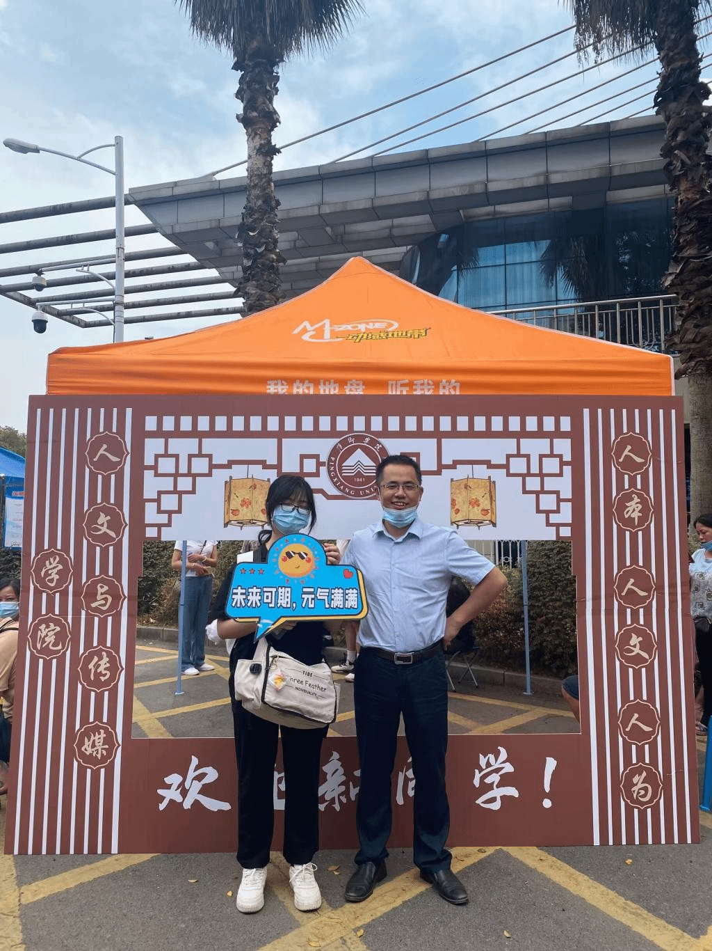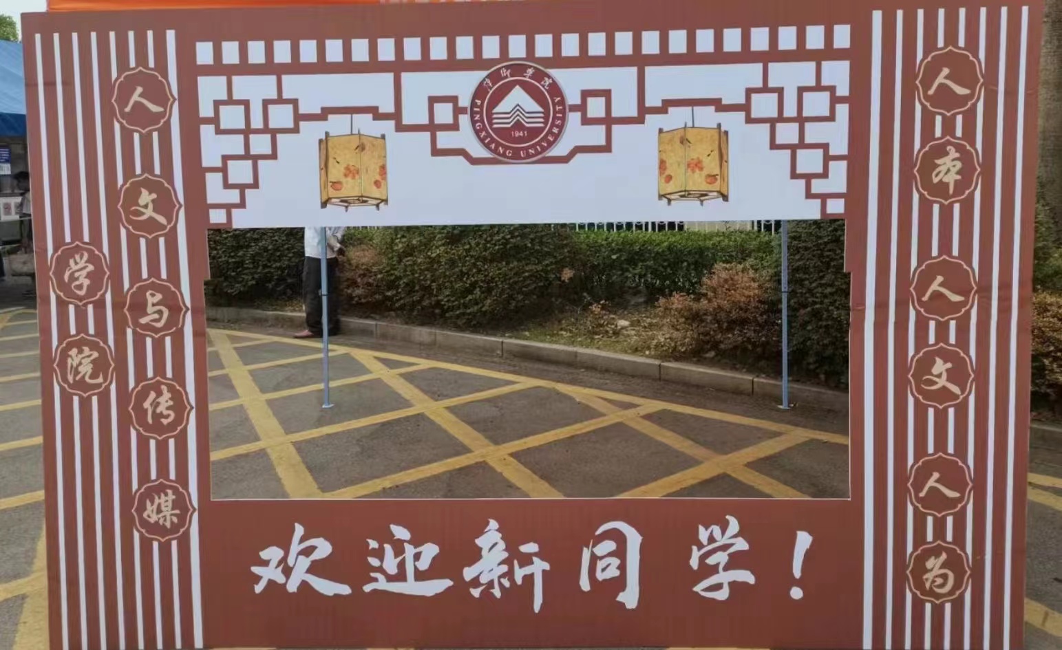 在萍乡学院西大门门口有这样一道独特的“风景线”,它是欧洲杯下单平台官网“人本、人文、人文”的标志,是文传学子朝气蓬勃、团结一心的象征,更是我们对新同学的期待,这就是今年我们为迎接新生和新生家长准备的创意合影展牌。