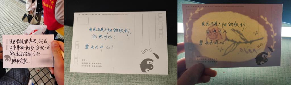 活动前期,推普团成员做好了充足的准备工作,包括绘制主题海报,准备书写物料及线上、线下双线宣传。活动现场,志愿者积极散发“说好普通话,写好规范字”的宣传单,并提供盲盒、精美明信片及信纸,供来往师生使用。参加活动的师生在纸上写下自己的心声并放入盲盒,随后,再从盲盒里抽取别人放入的信件。“我手写我心”,参加活动的师生得以用书写传达自己的生活点滴,以文字传达生活的喜怒哀乐,与他人共享快乐与烦恼,感受语言文字带来的别样魅力。这种手写祝福和烦恼的盲盒形式吸引了大量师生参与,活动现场气氛热烈,创造了一个良好的语言文字环境。