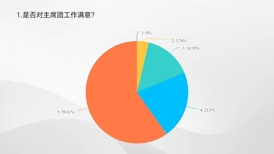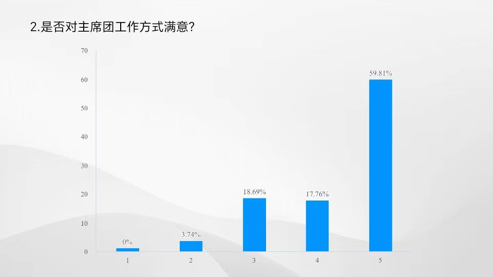 李鸿对此次民意调查报告进行了大致总结,参与调查的绝大多数同学对主席团成员表示高度肯定,并提出中肯建议。调查结果显示,同学们对主席团工作态度的总体满意度为4.53分,综合满意度较高。