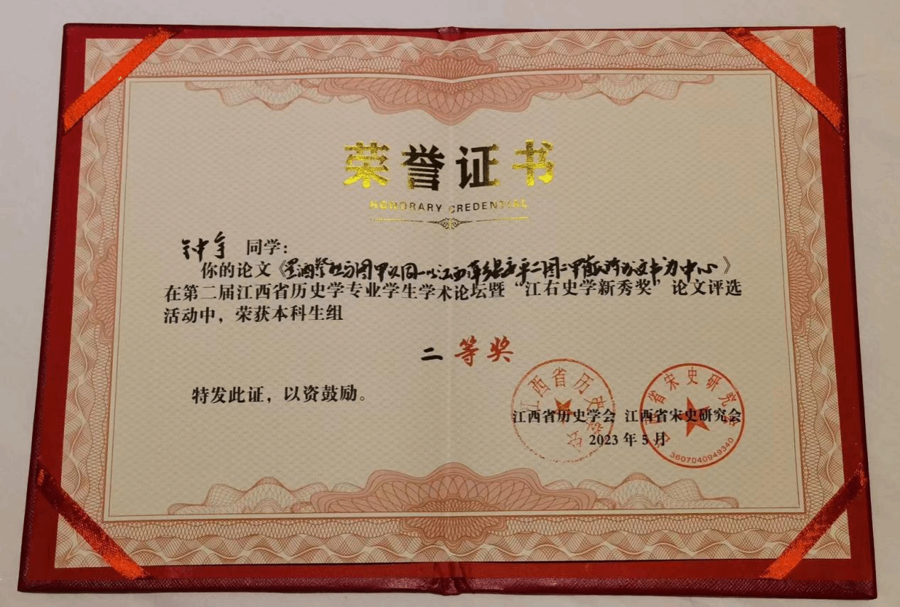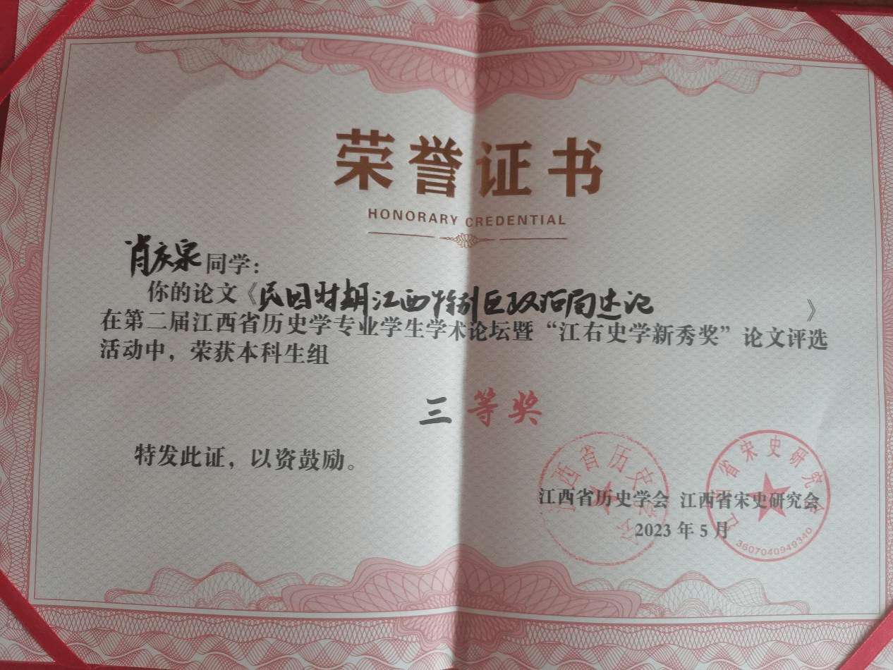 5月13-14日,第二届江西省历史专业学生学术论坛暨“江右史学新秀奖”论文评选活动在赣南师范大学黄金校区举行,我校历史学2020班钟宇、历史学2021班肖庆泉两位同学分别获得二等奖和三等奖,凌焰老师获得“优秀指导老师”称号。