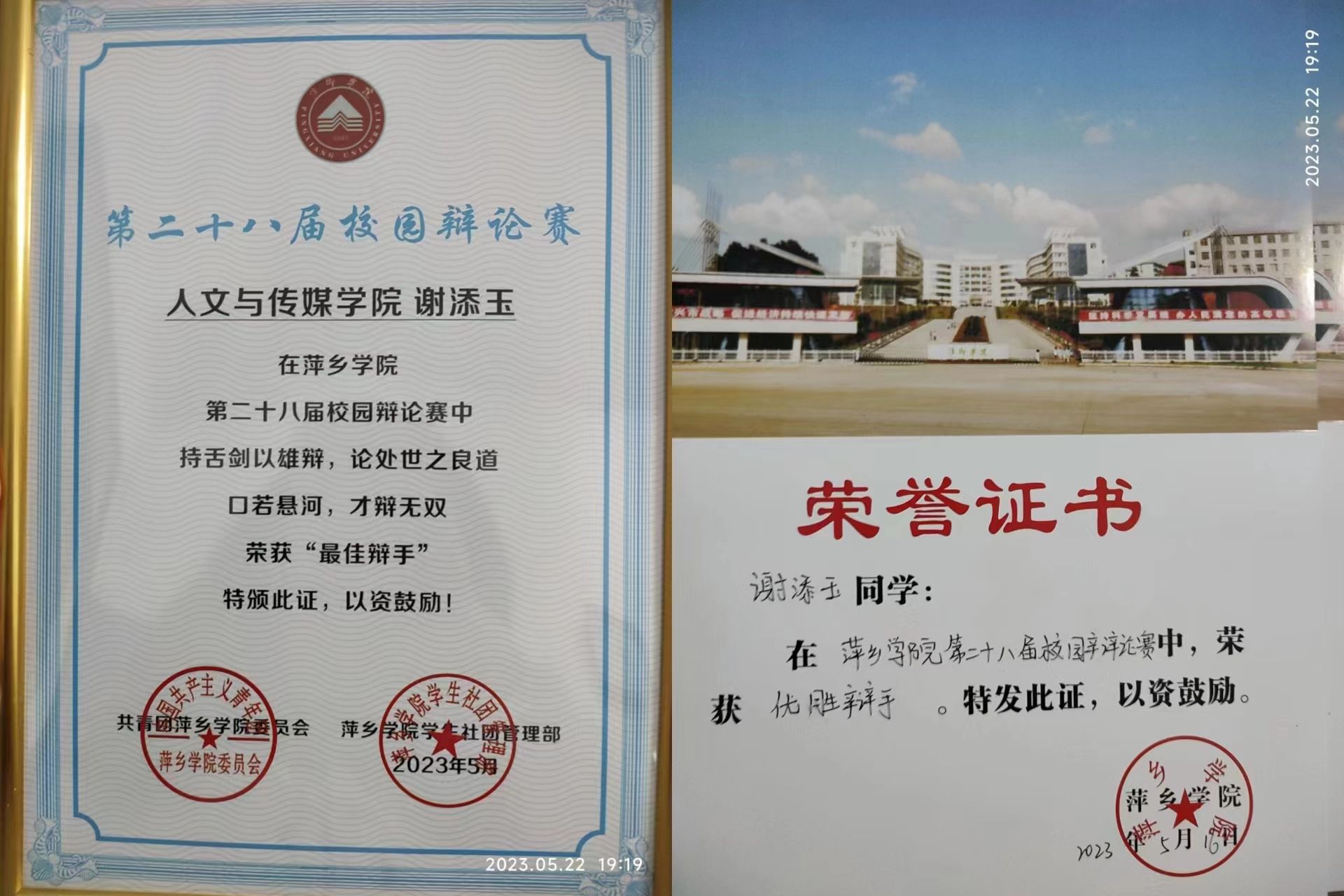 近日,萍乡学院第二十八届校园辩论赛圆满结束,欧洲杯下单平台官网辩论队夺得了本次比赛的冠军,欧洲杯下单平台官网辩手谢添玉荣获当场“最佳辩手”。