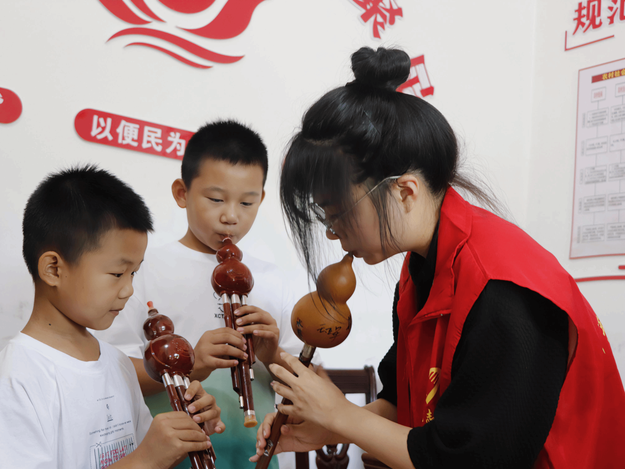 服务团成员郑佳琪为小朋友们讲诉了葫芦丝的来历及构造,并让他们上手实操,亲身体验葫芦丝的魅力。郑佳琪与小朋友们积极互动并依次对小朋友进行一对一指导,练习葫芦丝的基本音阶和简单乐曲,营造活泼的课堂氛围。随着手指在葫芦丝上轻盈地舞动,和谐美满的旋律在冲头村回荡,如同清脆的泉水在山间流淌。