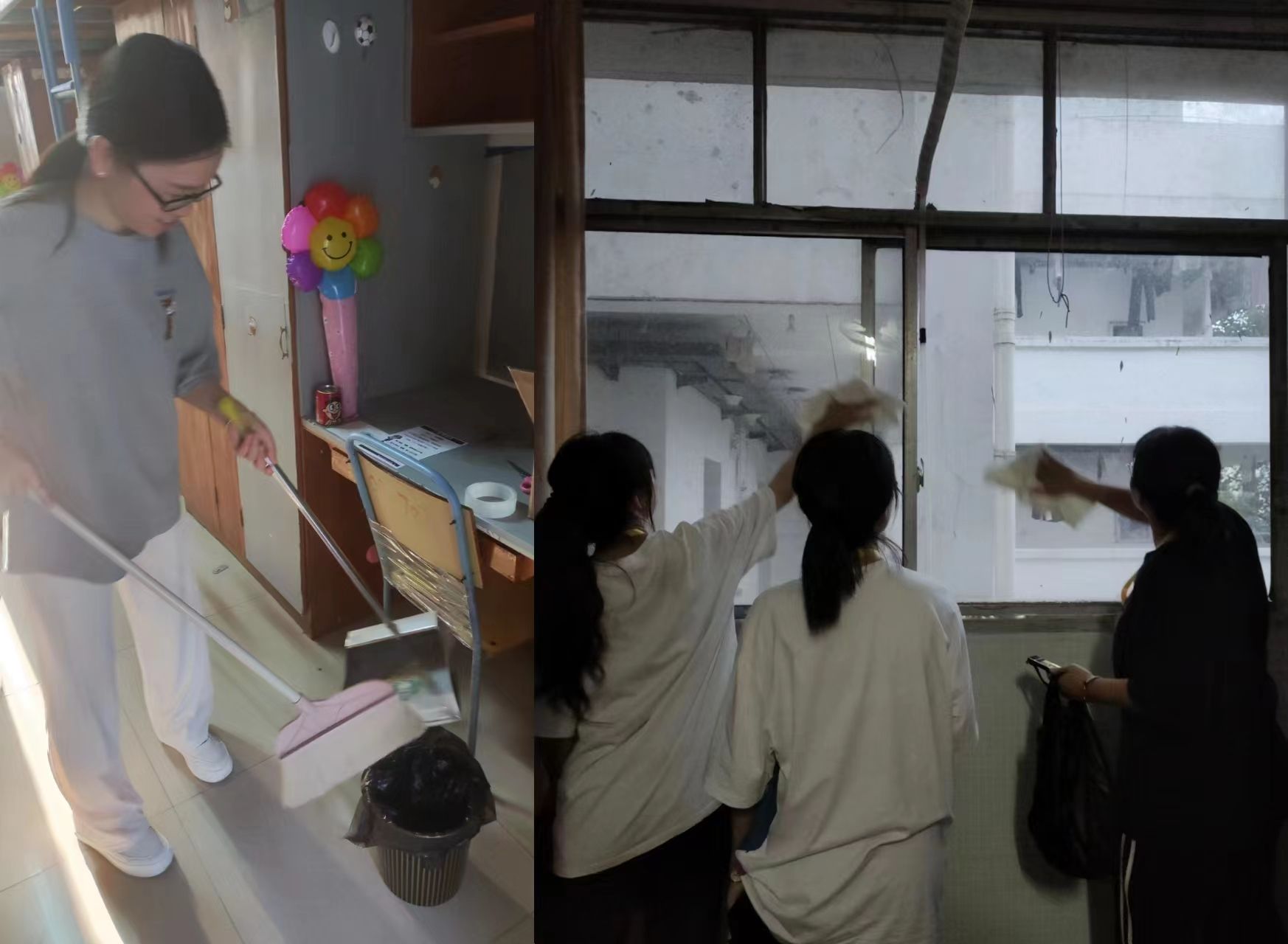 为了迎接新生的到来,学院老师曾多次下寝查看新生宿舍卫生情况、排查各种安全隐患以及内部设施是否有损坏等问题,并立即对相关问题采取措施进行整改。在寝室卫生方面,宿管会指导老师罗珺、丁婷身先为范,打扫新生寝室卫生,为学生树立榜样,给新生提供一个干净整洁的住宿环境。